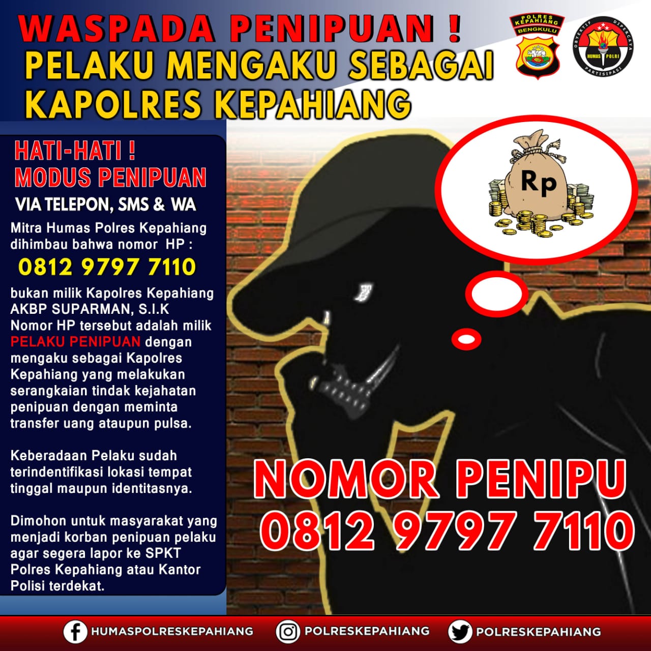 Pelaku menelpon dengan nomor 0812 9797 7110 mengaku sebagai Kapolres Kepahiang, dan minta uang sumbangan untuk biaya kegiatan serah terima jabatan Kapores Kepahiang kata pelaku penipu melalui kontak telepon. Permintaan pelaku langsung ditolak oleh korban dan menginformasikan peristiwa tersebut ke Polres Kepahiang.(rls)