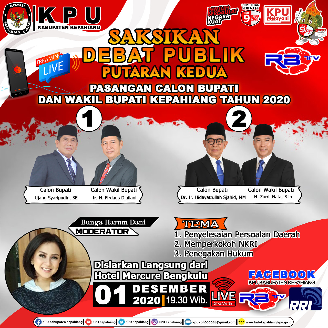 Debat publik tersebut dilakukan dalam Sesi Putaran ke 2 yang akan di selenggarakan secara Live pada 01 Desember 2020 pukul 19.30 WIB di RB TV dan Bisa juga saksikan di akun Facebook KPU Kepahiang.