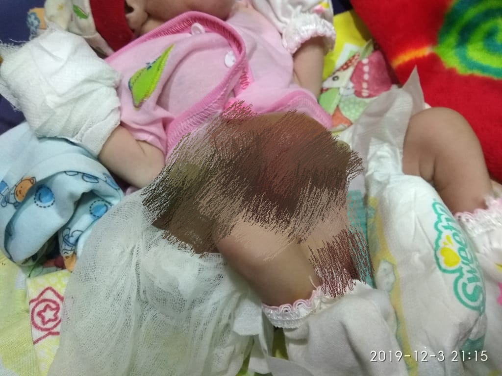 Bayi malang itu, mengalami cacat lahir pada dinding perut bayi dimana usus keluar melalui lubang disisi pusar.