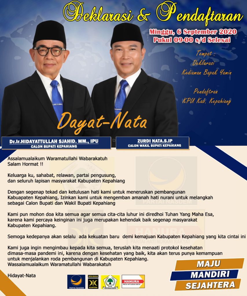 Dengan segenap tekat dan ketulusan hati pasangan Dayat-Nata menuturkan, untuk menuruskan pembangunan Kabupaten Kepahiang dan izinkan Dayat-Nata untuk mengemban hati nurani melangkah sebagai Calon Bupati dan Wakil Bupati Kepahiang.