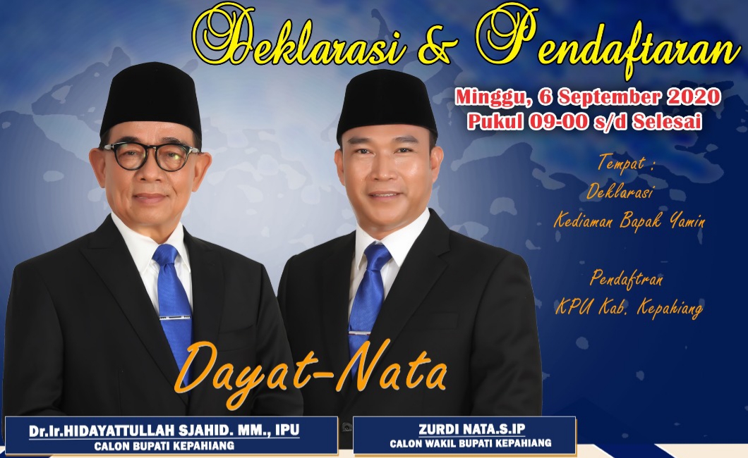 Dengan segenap tekat dan ketulusan hati pasangan Dayat-Nata menuturkan, untuk menuruskan pembangunan Kabupaten Kepahiang dan izinkan Dayat-Nata untuk mengemban hati nurani melangkah sebagai Calon Bupati dan Wakil Bupati Kepahiang.