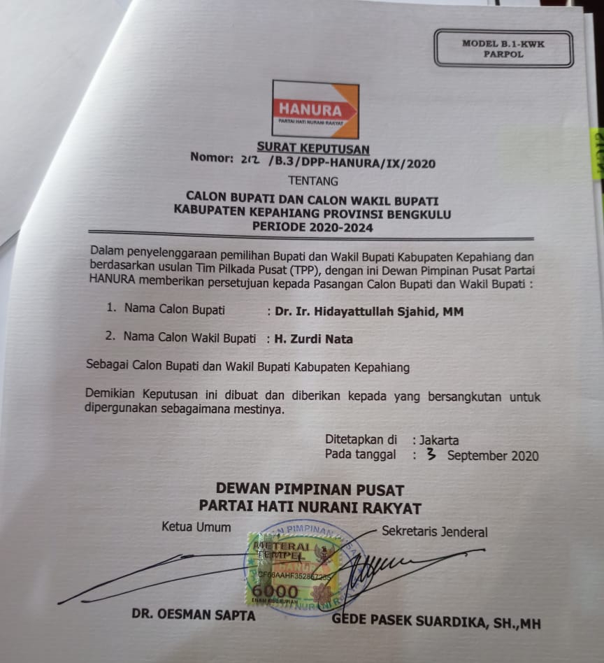 Terbukti dengan telah di keluarkan nya B1.KWK oleh DPP Partai Hanura dengan Nomor : 212/B.3/DPP-Hanura/lX/2020.