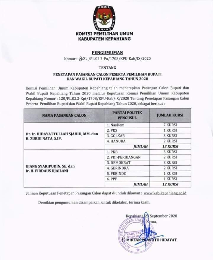Keputusan Komisi Pemilihan Umum Kabupaten Kepahiang dengan Nomor : 120/PL.02.2-kpt/1708/KPU-Kab/lX/2020 tentang penetapan pasangan Calon peserta Pemilihan Bupati dan Wakil Bupati Kepahiang Tahun 2020.
