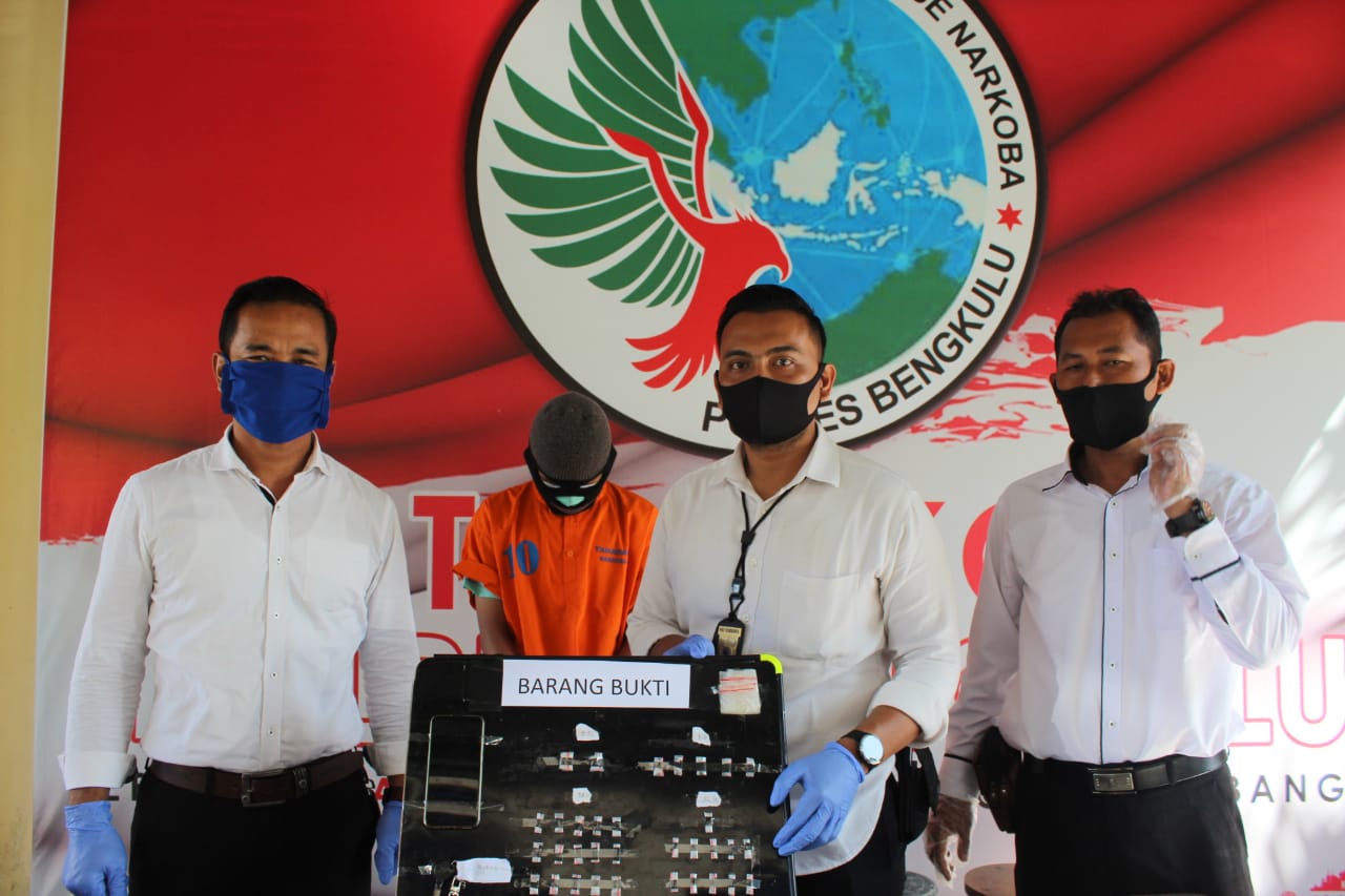 “Terduga pelaku MU ditangkap bersama 43 paket barang bukti narkoba jenis sabu yang dibungkus dnegan plastik klip bening didalam saku celana pendekk sebelah kiri, petugas kemudian membawa MU ke Polres untuk diperiksa,” terang Kapolres Bengkulu AKBP Pahala Simanjuntak S.IK melalui Kasat Narkoba Polres Bengkulu Iptu Sampson Sosa Hutapea S.IK kepada wartawan, Senin (20/4/2020).