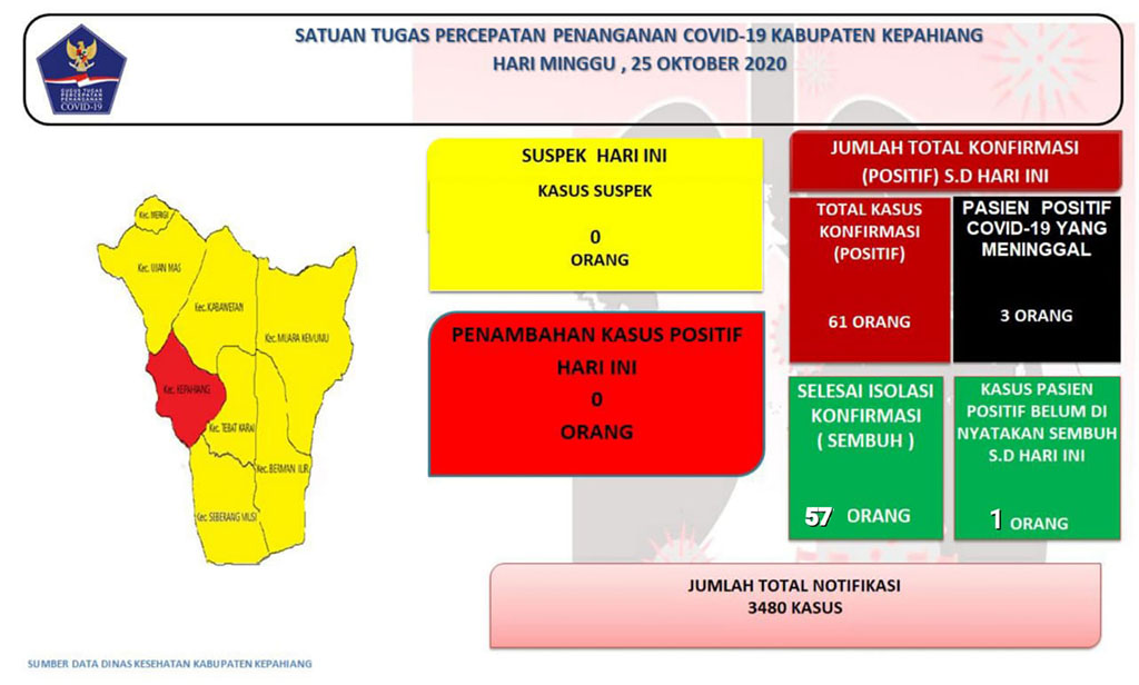 Total kasus covid-19 di Kepahiang, lanjut Tajri, tercatat 61 kasus. 57 orang dinyatakan sembuh dan 3 orang meninggal dunia.