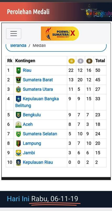 Inilah daftar perolehan sementara Rabu 06-11-2019, Medali Porwil Ke-X Se-Sumatera Th.2019 di Bengkulu.