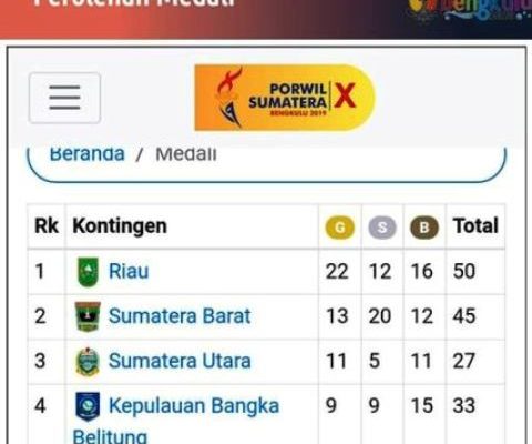 Inilah daftar perolehan sementara Rabu 06-11-2019, Medali Porwil Ke-X Se-Sumatera Th.2019 di Bengkulu.